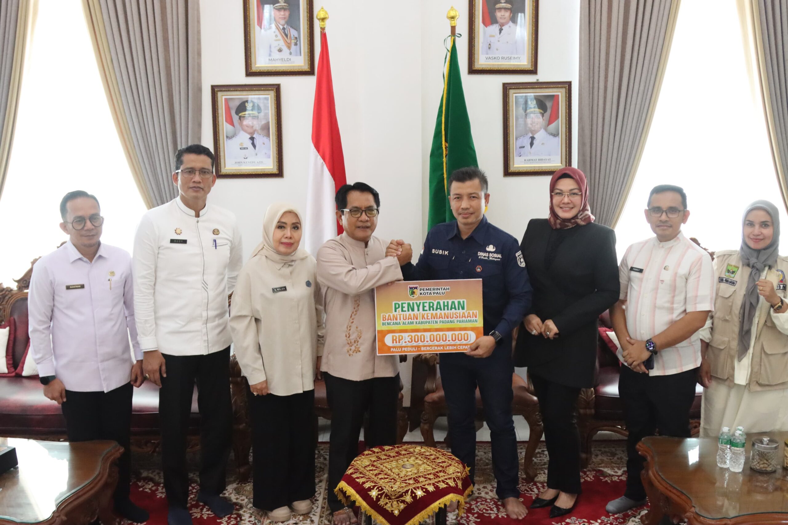PALU – Wali Kota Palu melalui Kepala Dinas Sosial, Susik, menyerahkan secara simbolis bantuan kemanusiaan untuk penanganan bencana alam di Kabupaten Padang Pariaman, Jumat (05/12/2025), di Kantor Bupati Padang Pariaman.