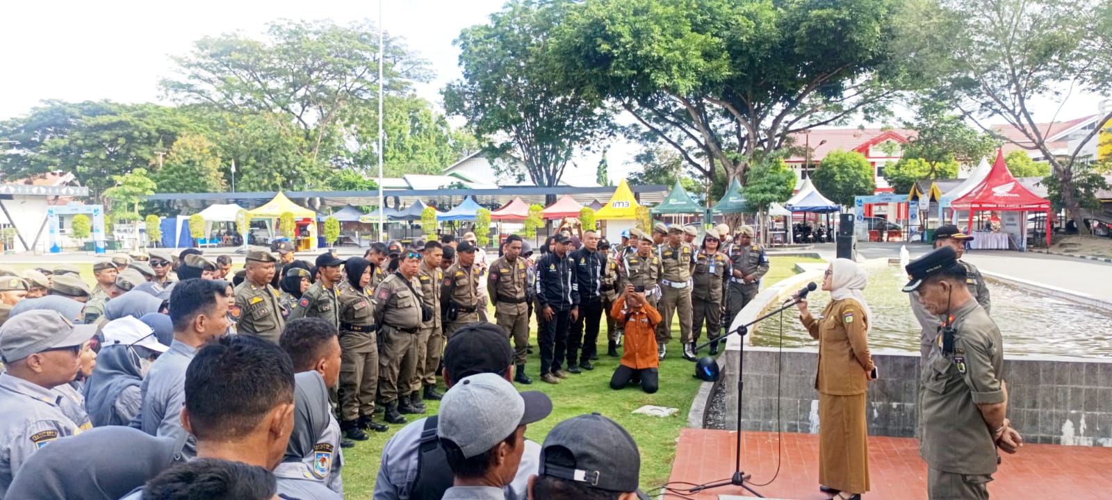 PENGARAHAN - Sekretaris Daerah, Irmayanti, menyampaikan pengarahan kepada ratusan personel Satuan Polisi Pamong Praja (Satpol PP) dan Linmas Kota Palu dalam rangka pengamanan Idulfitri 1447 H/2026 M, pada Senin (16/03/2026). FOTO: IST